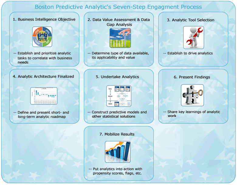 At Boston Predictive Analytics, we use affordable machine learning and statistical analysis to help our clients increase profits and improve productivity and customer satisfaction. We strive to become a valuable source of knowledge and to promote improved leadership and technical competence. Our team members are encouraged to achieve financial, spiritual, and emotional growth and form win-win relationships with any person or organization with whom we do business.